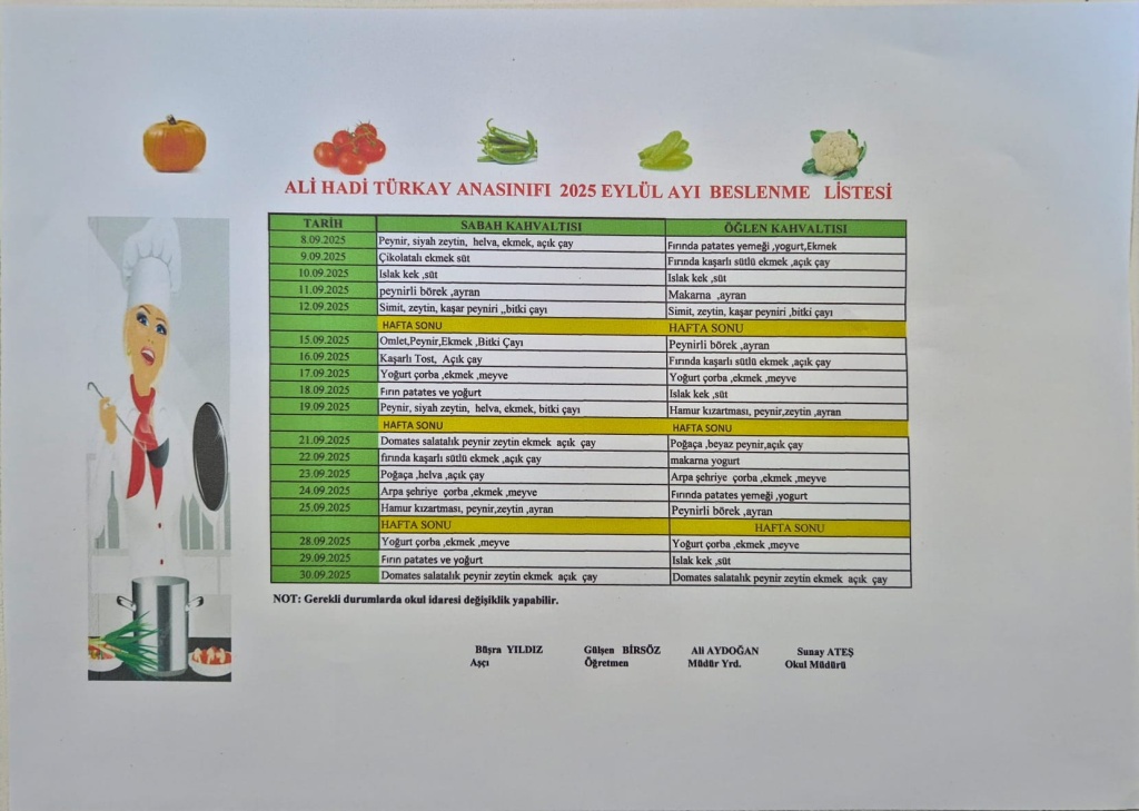 ANASINIFI 2025 EYLÜL AYI BESLENME LİSTESİ